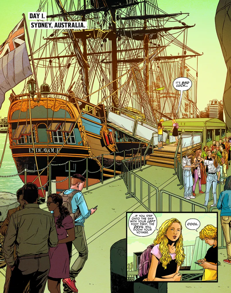 Straight out of the port, Endeavour #1โs story will feel very familiar. It is, in a very real sense, a modern take on the plot of Lord of the Flies by William Golding. That novel centers around a group of British school boys who find themselves stranded on an uninhabited island and follows their attempt at self-governance, attempts that quickly descend into brutality and savagery. While Endeavour #1 doesnโt quite go that far โ this is the first issue in a series, after all โ the groundwork is there. The issue follows a group of elites as they embark on a luxury adventure aboard an 18th century ship, the Endeavour. The group is made up of various adults โ all with some measure of wealth and privilege โ and kids, with the kids ranging in age from very young to pre-teens. The story is narrated by one of the pre-teens, Victoria โViaโ Wright, who among those on board is the only one who seems to be genuinely interested in the history of the ship and everything it means.