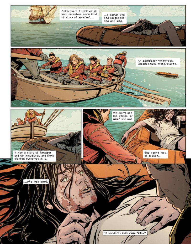 Itโs not giving anything away to reveal that what is supposed to be a trip of a lifetime turns into the stuff of nightmares very quickly. Just six days into the excursion, the adults are dead and the kids are left alone on the open sea now stuck with not only the crushing impact of grief and loss, but the challenge of survival. Now, the good news is that we can (probably) safely assume that someone survives this โ Via is narrating the tale for us and gives us some clues that sheโs recounting events years later. But what makes Endeavour #1 stand out beyond the sense that we are getting a survivorโs recollections is the way Phillips has structured the story. While the Lord of the Flies type tale is very common, what Phillips does here is give it a depth by incorporating the history of the Endeavour into the tale. Before we even get to our cast of characters in the modern day, weโre given a bit of an overview of the Endeavourโs dark history. And itโs further sprinkled throughout the story as well, a harbinger of what our characters will experience in the present day. This framing gives the story something of a unique sense. It feels, in a way, almost like a ghost story which certainly sets a unique tone.
