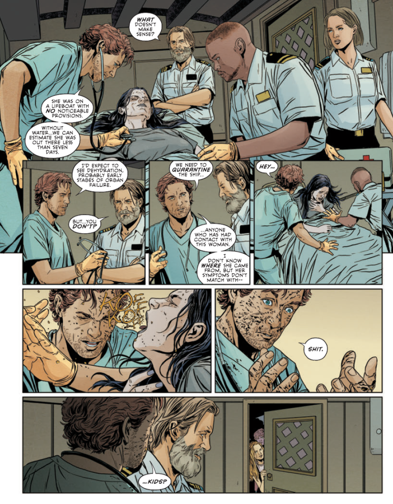 Beyond the writing, Endeavour #1 is also a visual treat. Lamingโs art does a fantastic job of marrying both the 18th century Endeavour ship with the more contemporary characters dealing with this current hell without ever losing the integrity of either era. Lee Loughridgeโs colors are also very well done, particularly in the shift from pages and panels that are set in different times. The visual differentiation in this issue is smart and clean, allowing the reader to absorb the information without having to step too far out of the action to understand where they are in time. And, of course, thereโs a final image on the deck of the ship with the surviving children bathed in moonlight and horror that is both stunning and chilling in equal measure.
