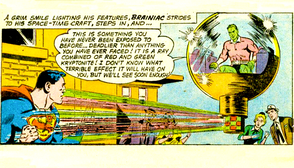 Perhaps the most dangerous piece of “manufactured” Kryptonite is the Red-Green iteration created by Brainiac and introduced in Action Comics (1938) #275. The story does not fully explain how Brainiac combines the effects of Green and Red Kryptonite into a ray gun. However, after shooting Superman with the Red-Green Kryptonite ray, the effects are immediately apparent: Superman begins to feel strange and weaker. The ray’s most bizarre consequence is the growth of a third eye on the back of his head. Concerned that this unusual feature would reveal his secret identity, Superman resorts to wearing hats to conceal the extra eye. Interestingly, on a positive note, Red-Green Kryptonite also has the unexpected effect of enhancing Superman’s heat vision.