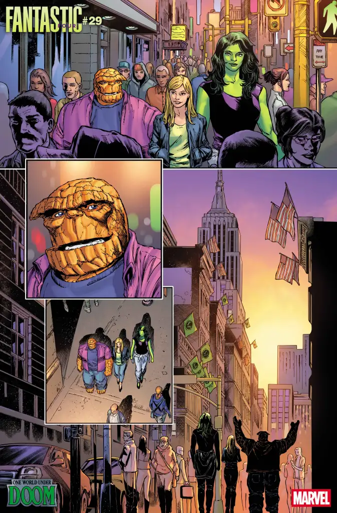 ComicBook has the exclusive first look at Fantastic Four #29 by writer Ryan North and artist Cory Smith. It’s a tie-in to “One World Under Doom” and guest stars She-Hulk. The first preview page features Emperor Doom standing with his arms folded behind his back as his Latverian flag waves in the wind, and giant buildings taking up the background. Next, Ben Grimm and Sue Storm get the kids off for a bus trip, but Sue doesn’t look happy once the kids are gone. This is where Ben gets the idea to take Sue out into New York City, and what better person to join them than Jennifer Walters, aka She-Hulk.