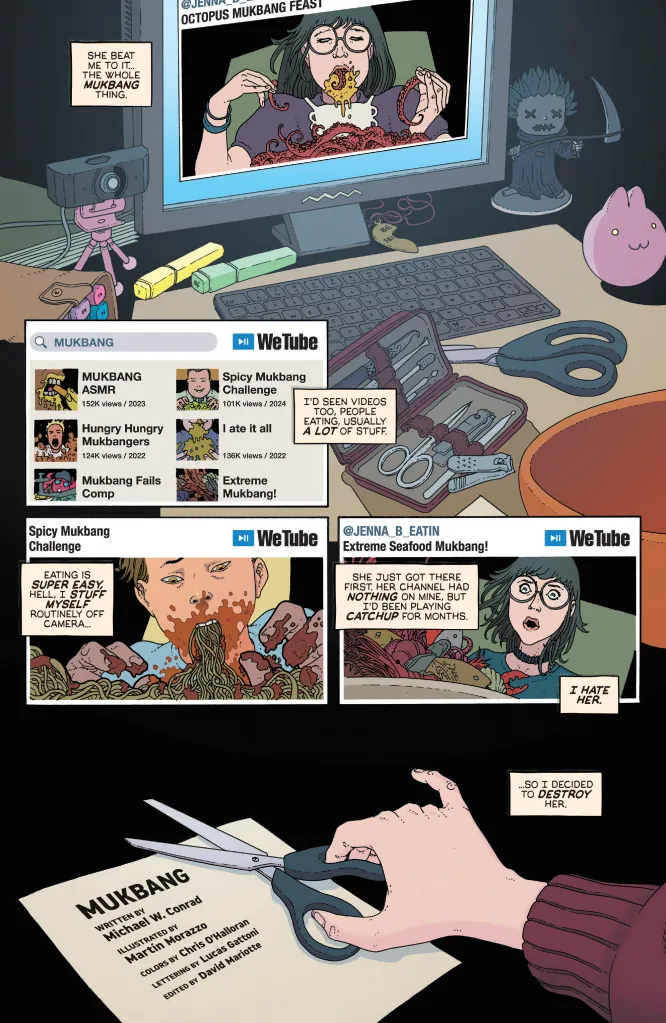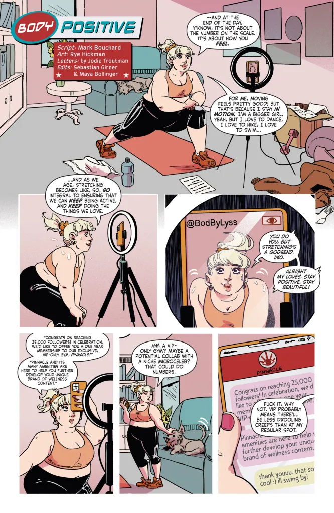 Hereโ€™s how BOOM! Studios describes Hello Body Horror #1: โ€œIn โ€˜Body Positivityโ€™ by Mark Bouchard and Rye Hickman, a fitness influencer striving for greatness has her mind go where her body cannot followโ€ฆ yet. In โ€˜Minimal Scarringโ€™ by indie sensation Derick Jones, a plastic surgeon who caters to the ultra-rich uses what pieces they leave behind to transform himself. Also featuring stories by Michael W. Conrad, Martin Marazzo, Jeremy Bastian, Ziyan Qiu, Jenna Cha, and Robert Hack for a veritable โ€˜Whoโ€™s Whoโ€™ in โ€˜Kill U Comics!โ€™โ€