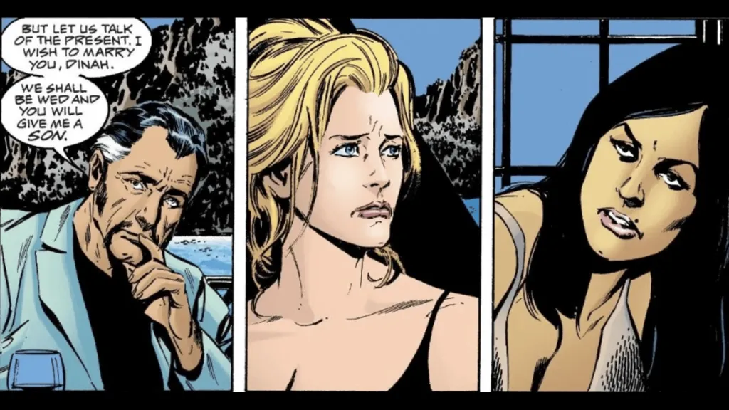 At this point, Ra’s was more than eager to take advantage of Dinah’s unique situation to try and convince her to be with him and even have children with him. At one point in Birds of Prey #33, Ra’s declares, “But let us talk of the present. I wish to marry you, Dinah. We shall be wed and you will give me a son.” Dinah and Talia, Ra’s cherished daughter, both have an astonished look on their faces as Dinah gets up from the table and walks away from the conversation. When they speak in private, Dinah tells her lover that she’s not unhappy about him asking her to be his wife, but because she can’t have children.