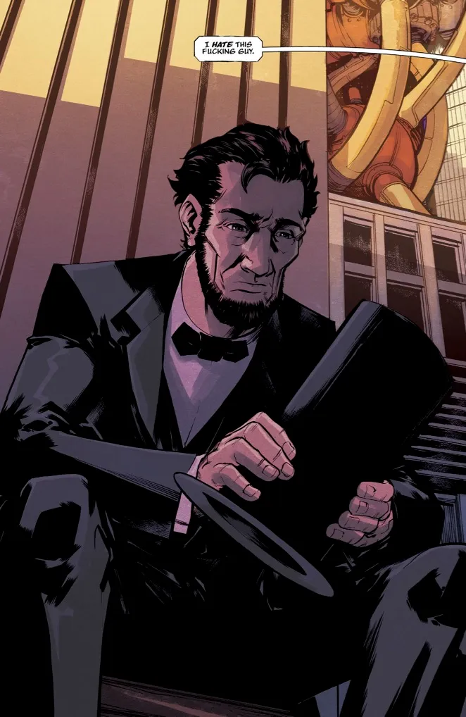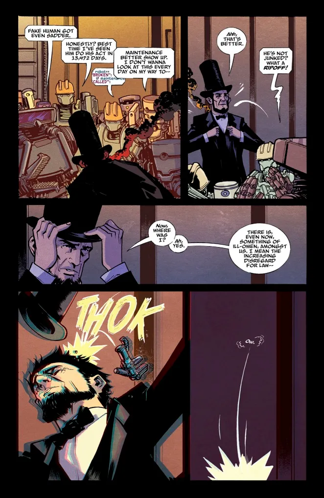 The best science fiction looks forward as much as it looks back but maybe we just were a little more literal with that here. Originally the animatronic Abraham Lincoln wandering the globe at the end of the world was just something that I got stuck in my head one day and couldn’t shake. Here you have this historical figure who has become this larger-than-life icon representing compassion, leadership, perseverance, and just generally personifies this idea of the American spirit in so many ways. He’s the face on Rushmore; he’s the man in the monument. But he’s also this folksy sort of hero, famous for his kindness and his quirks. And then you have this version of him, brought back to life through state-of-the-art technology (at the time), and you get this awkward contrast. The legend made real, but somehow not real at all. Through him you begin to see these cracks in the seams which often happens when we look too close at our history. We memorialize him and honor him, but do we carry on the ideas that he championed? Having this anachronistic robot in an apocalyptic future who represents a better past in a sort of cartoonish way, was something that really felt like it could bring us to really fun places. From there it all started to spin out in a lot of fun and unexpected ways. Thinking about what the real Lincoln represents, what this replica of him represents, and what it means to be a fake man from the past who is lost in the future, all of that just felt like fertile ground to tell stories that are both huge in scale and deeply intimate. Also, it’s an excuse to have Robot Lincoln arguing with a toaster.