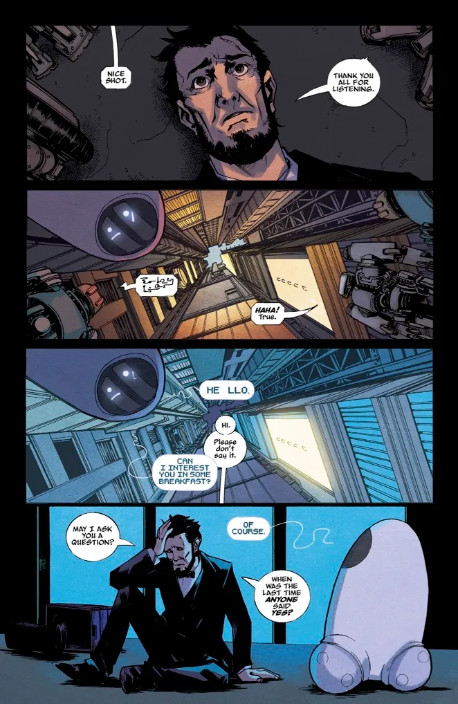 Something we loved about this first issue was how you could take these incredibly haunting ideas (like a robot reflecting on its last interaction with its humans) and imbue it with an element of whimsy just with some quirky dialog. How did the three of you hold that tension when you were creating this story? In less capable hands it could either be too bleak or come off as flippant!