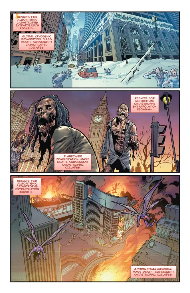 DC released a preview of Justice League Red #1 by Saladin Ahmed, Clayton Henry, Arif Prianto, Lucas Gattoni, and Ryan Christy. It begins with three glimpses at possible futures that all end in catastrophe: global cryogenic devastation, planetwide zombification, and an Apokoliptian invasion. All these scenarios are being run through a catastrophe algorithm trying to predict future outcomes. Unfortunately, the results are the same again and again. If someone doesn’t act now, there will be no future for the Earth. The only hero on the Justice League with the foresight to see what is coming is Red Tornado.
