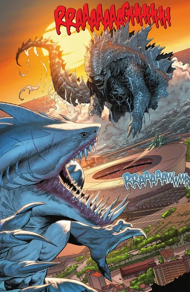 Meanwhile, Lex Luthor and Enchantress combine their unmatched scientific and magical abilities to run phase one of the Squadโs experiment on King Shark. They infused him with some kind of arcane energy, and King Shark got bigger, bigger, and bigger, until he was as massive as Godzilla himself. Unfortunately, the monstrous increase in size and power had the opposite effect on his mind, and King Shark rampaged across Cape Town. That is, until Godzilla detected yet another Titan he had to teach a lesson.