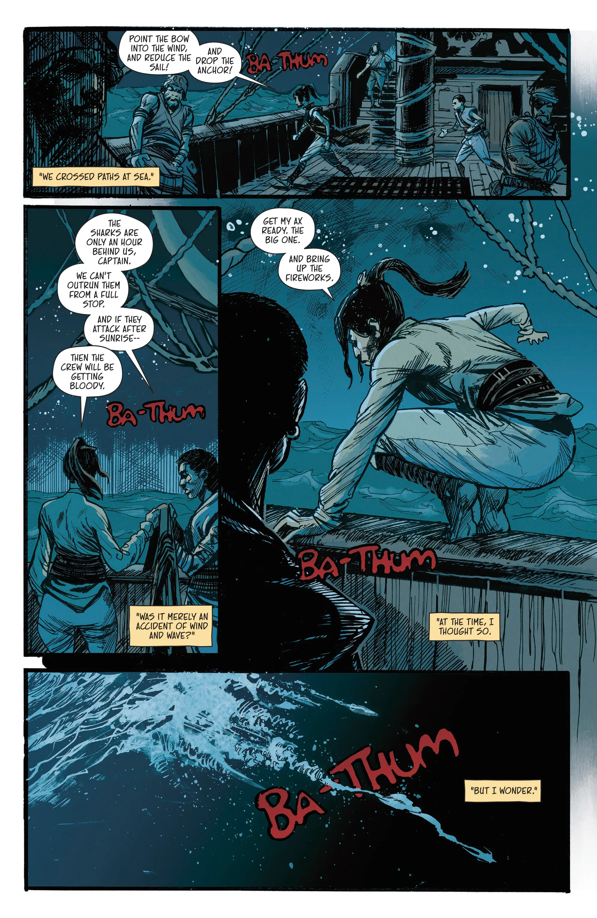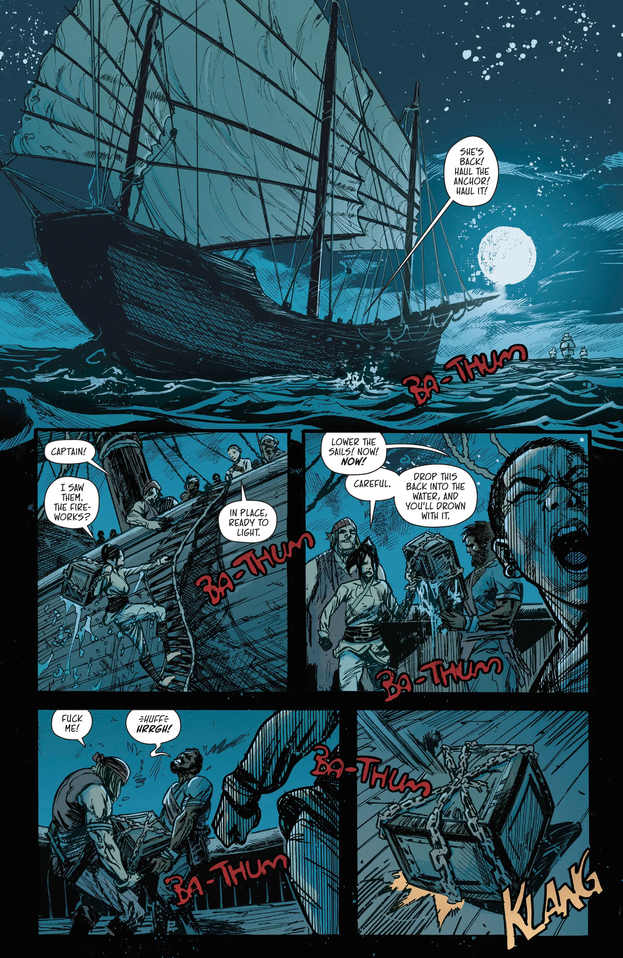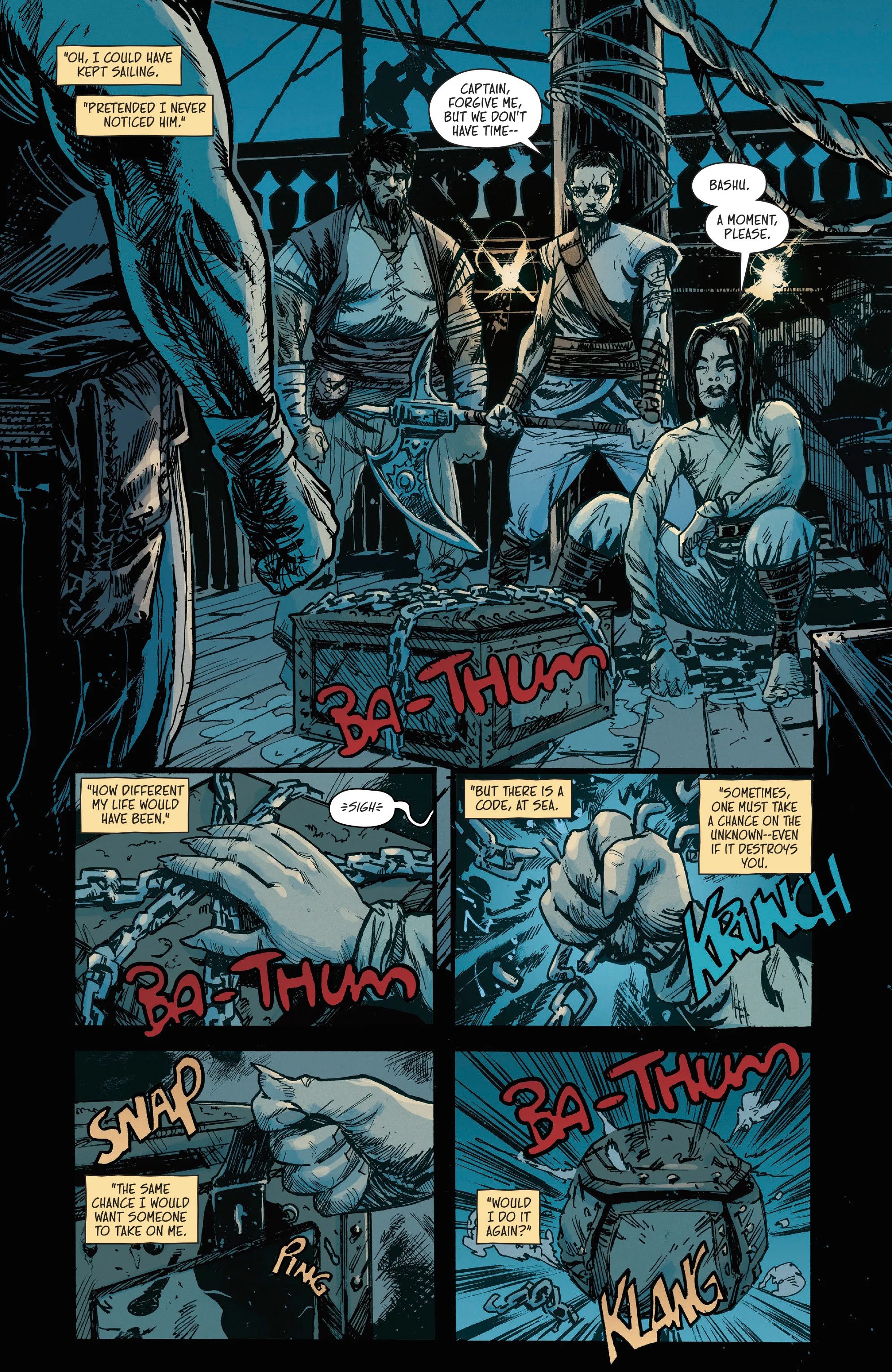 BRZRKR: The Bleeding Tide introduces fans to a pirate captain and her crew as she tries to track down a mysterious heartbeat ringing through the ship. It turns out that heartbeat lies at the bottom of the ocean in a chained container, and despite their enemies closing in, they bring the container up to the surface in hopes that whatever is inside can turn the tide.