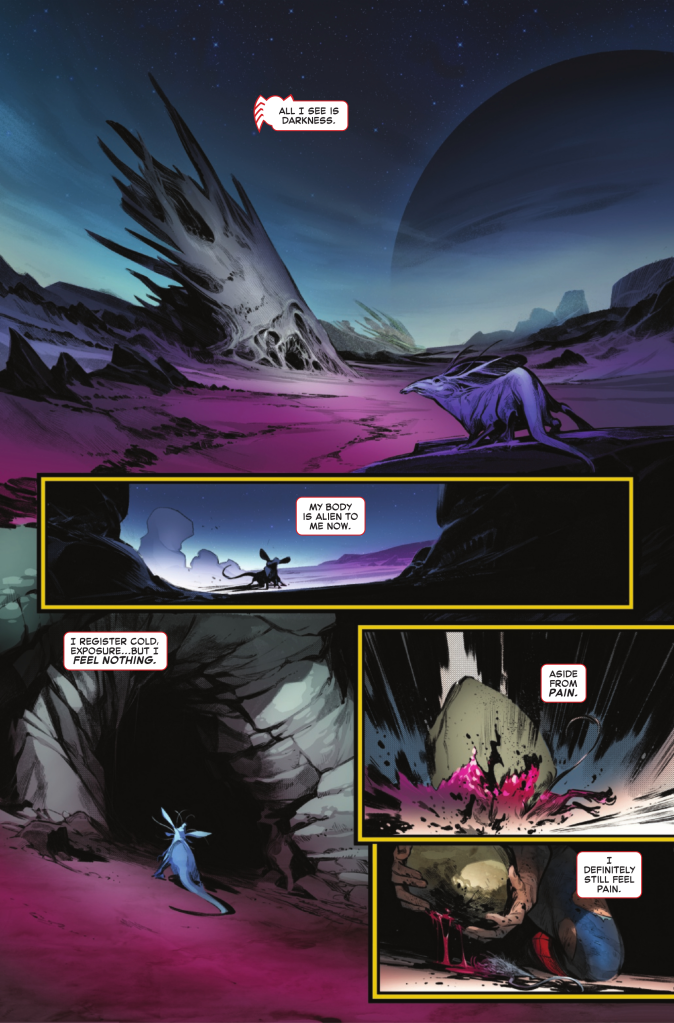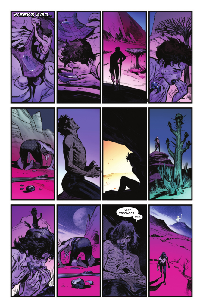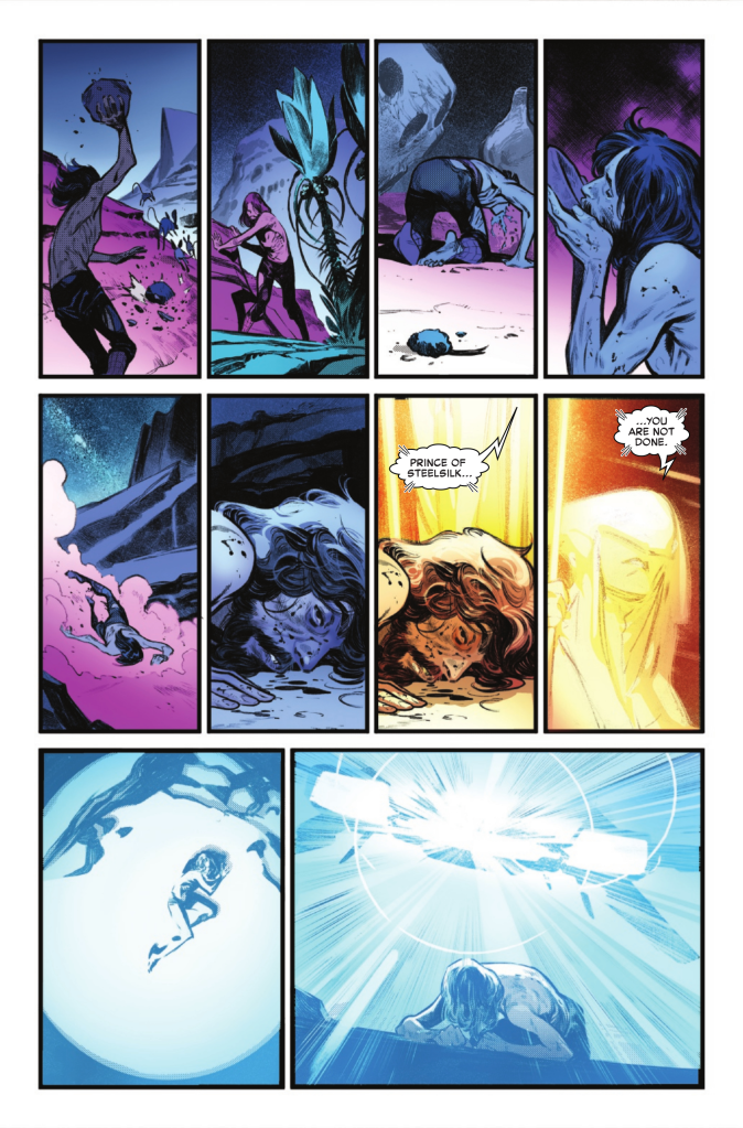 We cut back to weeks before, presumably just after Peter arrived. He used his shirt to gather water, and we see him wander the wasteland of the planet heโ€™s trapped on. His injuries from Hellgate show as he stumbles around, and almost everything he eats makes him puke. He gets thinner and weaker, recalling Hellgateโ€™s plea for him to get stronger. His spirit takes the biggest toll as we see him scream repeatedly and the light die behind his eyes. However, a strange figure is following him the entire time. Just as Peter collapses and lays, ready to give up, the figure approaches. They call him the Prince of Steelsilk and tell him that he isnโ€™t done yet. Just then, a ship arrives and catches the reviving Spider-Man in its light.