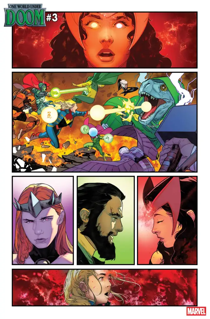 Captain Marvel mounts the Avengers’ two-pronged attack: while magic users led by Scarlet Witch and espionage experts like Black Widow infiltrate capitals to liberate the world’s leaders from Doom’s influence, another team of heavy-hitters will bring the fight to Doom as a distraction.