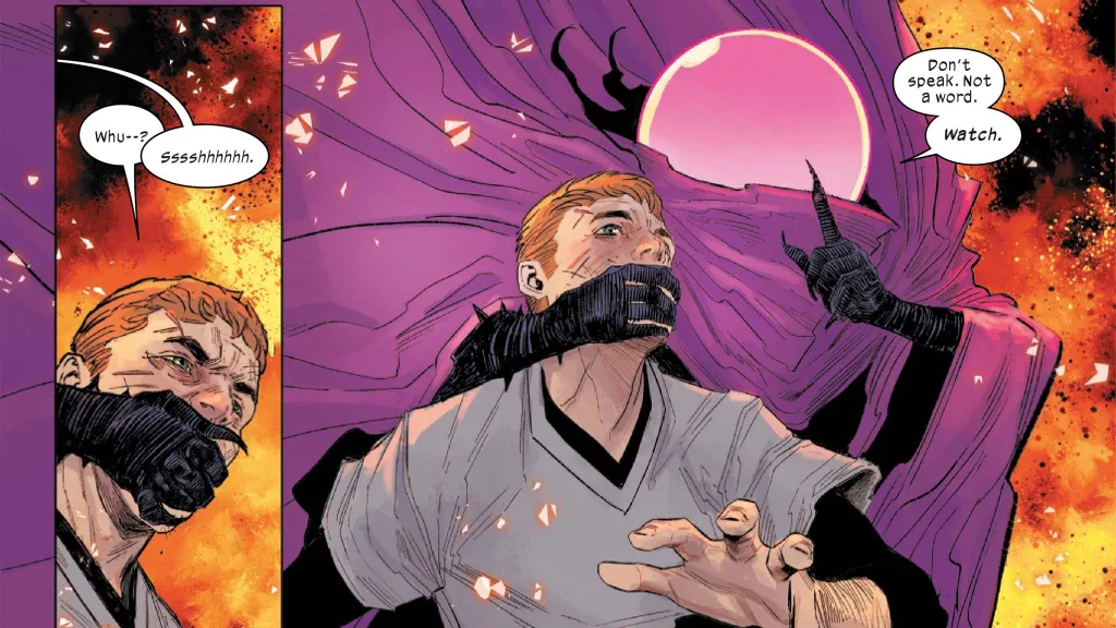 If those were enough massive revelations for you, Ultimate Spider-Man #16 saved perhaps the best for last. We continue moving through Gwen Stacy’s timeline, reaching the point where Peter Parker and Harry Osborn are trying to escape from Kraven the Hunter in the Savage Land. A Mysterio visits Gwen to let her know where Harry is, and she crafts a plan to save her husband. We come to the moment when Kraven is about to kill Harry, but the moment changes to include Mysterio. The master of illusions covers Harry’s mouth and tells him to be quiet and watch.