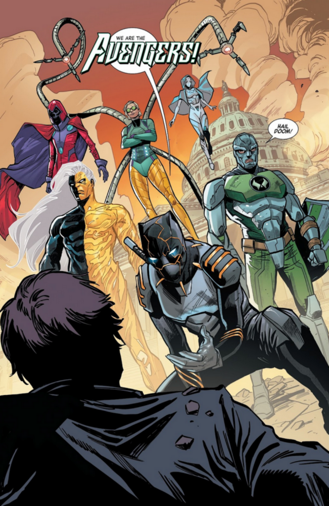 They are also suspicious of Doom. In private, Olivia (codename Doctor Octopus) reminds her teammates of their actual mission. They hail from Anno Doom +128, and are the few survivors of the final incursion that destroyed universes across the multiverse (in Secret Wars).