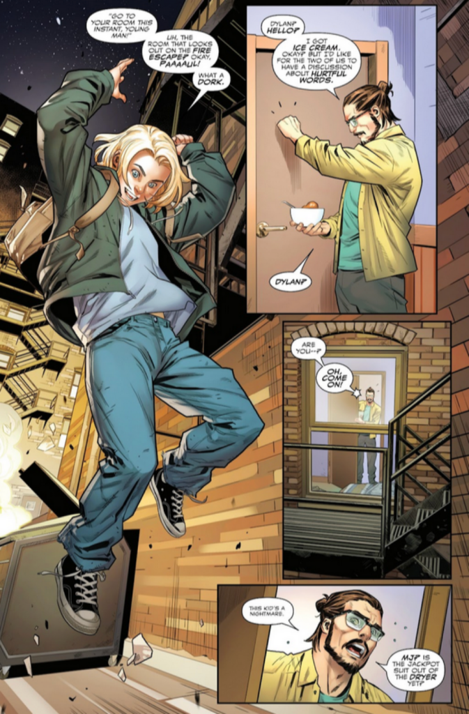 Dylan has also spent the first four issues mocking “dork” Paul, his vegan couscous, and his man bun despite being taken in by Paul and MJ — and Dylan’s father figure being bonded to his Symbiote father is a possibility he wouldn’t expect, potentially explaining why Paul has been absent from the official list of suspects.