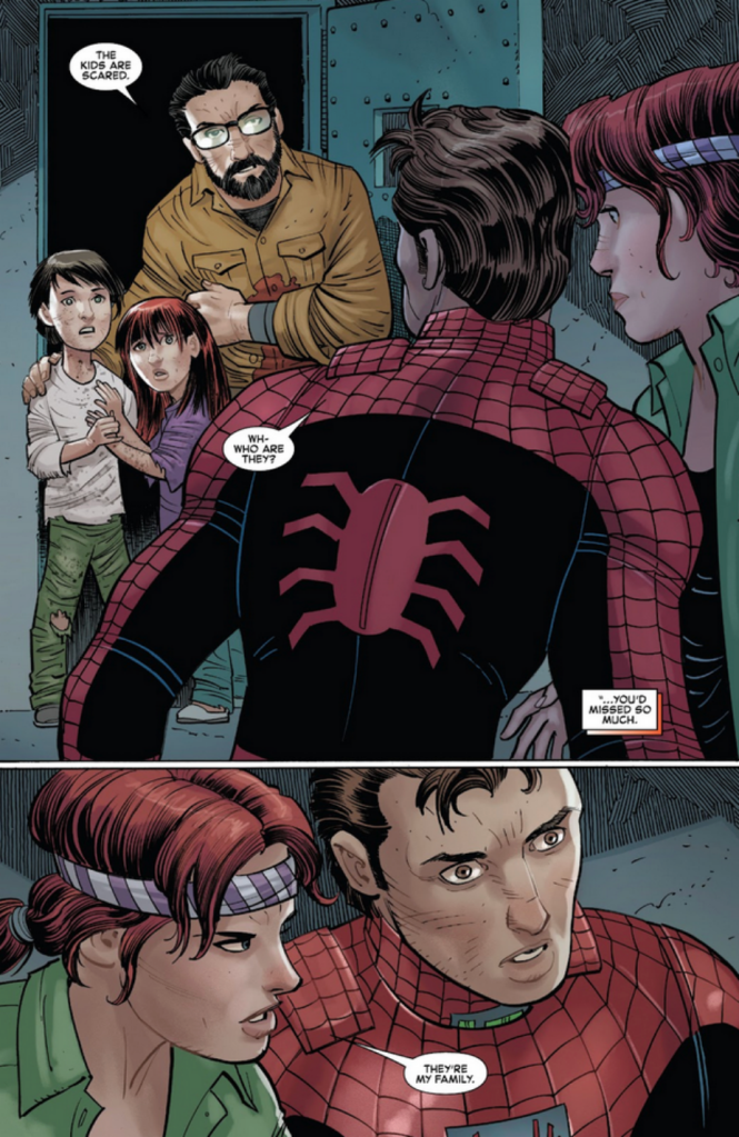 While Mary Jane was stranded in this dystopian dimension with Paul (who turned out to be Rabin’s son), a situationship developed as days turned into weeks, weeks into months, and months into years. (While weeks passed on Earth, the missing Mary Jane spent four years with Paul.) It was during this time that Paul and Mary Jane raised adopted children, Owen and Romy, and Mary Jane became both a mother and the superhero Jackpot.