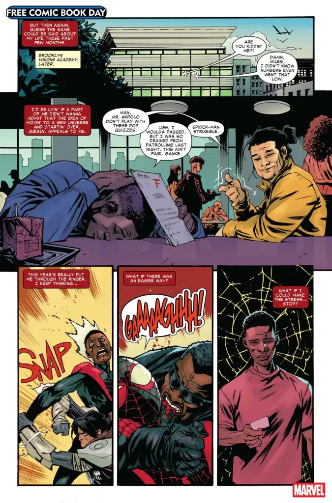 Added Ziglar, “I can’t spoil anything, but Miles and Billie’s experience in the Ultimate Universe will definitely end up affecting the 616 in big, fun ways!” See the just-released preview pages below, which recaps recent events from Ziglar’s ongoing Miles Morales: Spider-Man run.