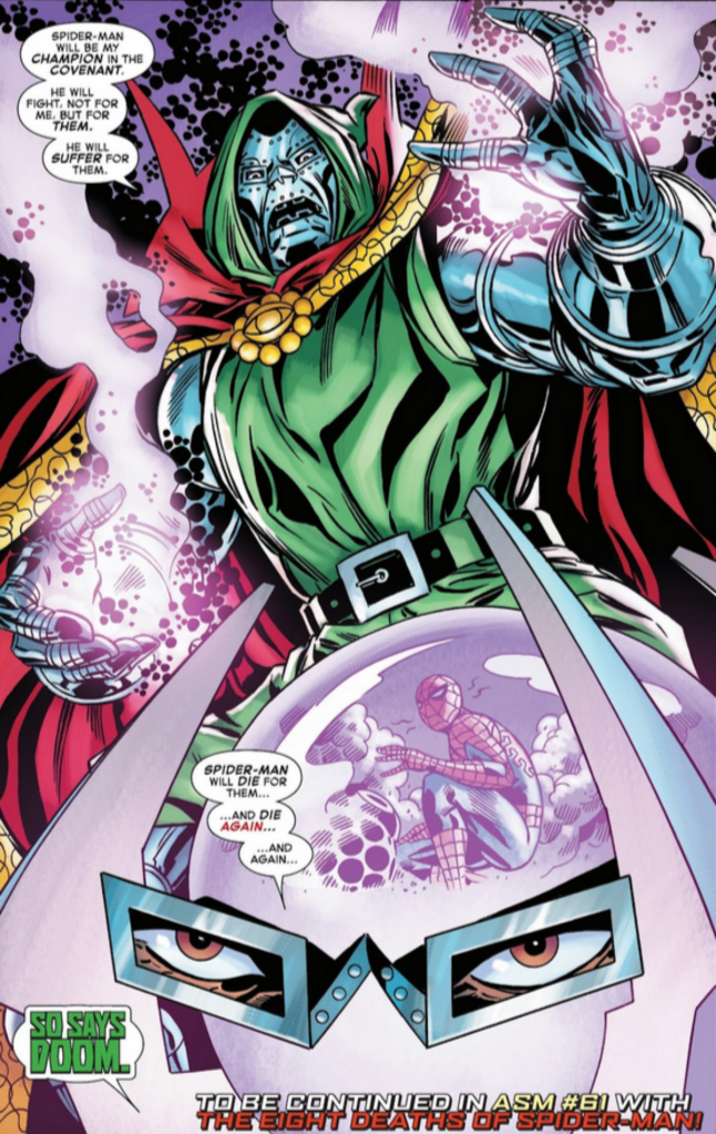 “Great suffering will be required in the works ahead,” Doom decides. “Spider-Man will be my Champion in the Covenant. He will fight, not for me, but for them. He will suffer for them. Spider-Man will die for them… and die again… and again… so says DOOM.”