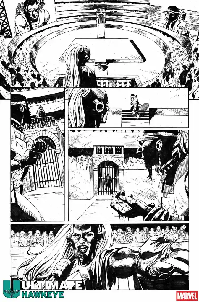 The first look at Ultimate Hawkeye #1 features Hawkeye letting their arrows flow as they blow up a doorway to enter what looks like an arena. After defeating some fire-breathing lizard creatures, Hawkeye finds themselves in the center of the arena filled with a hungry audience, and Exterminatrix on the loudspeaker. Hawkeye holds what must be an injured wrist, and Exterminatrix introduces Ronin as Hawkeye’s next opponent.