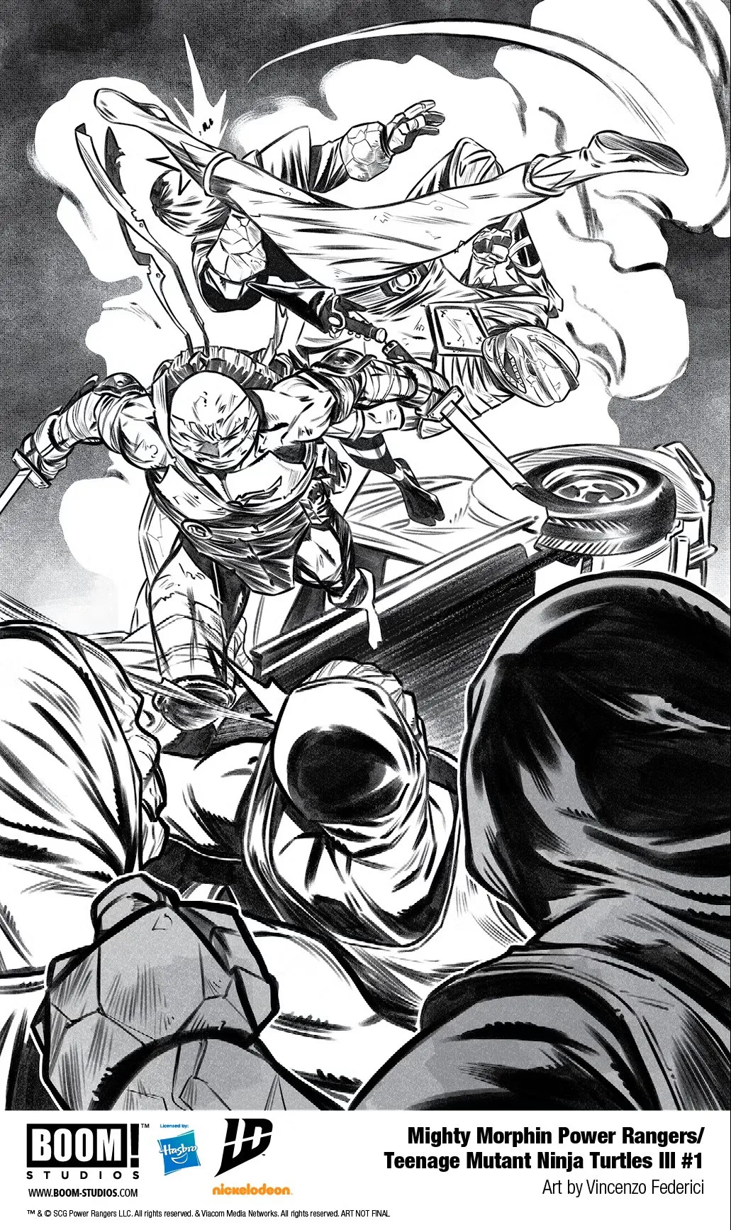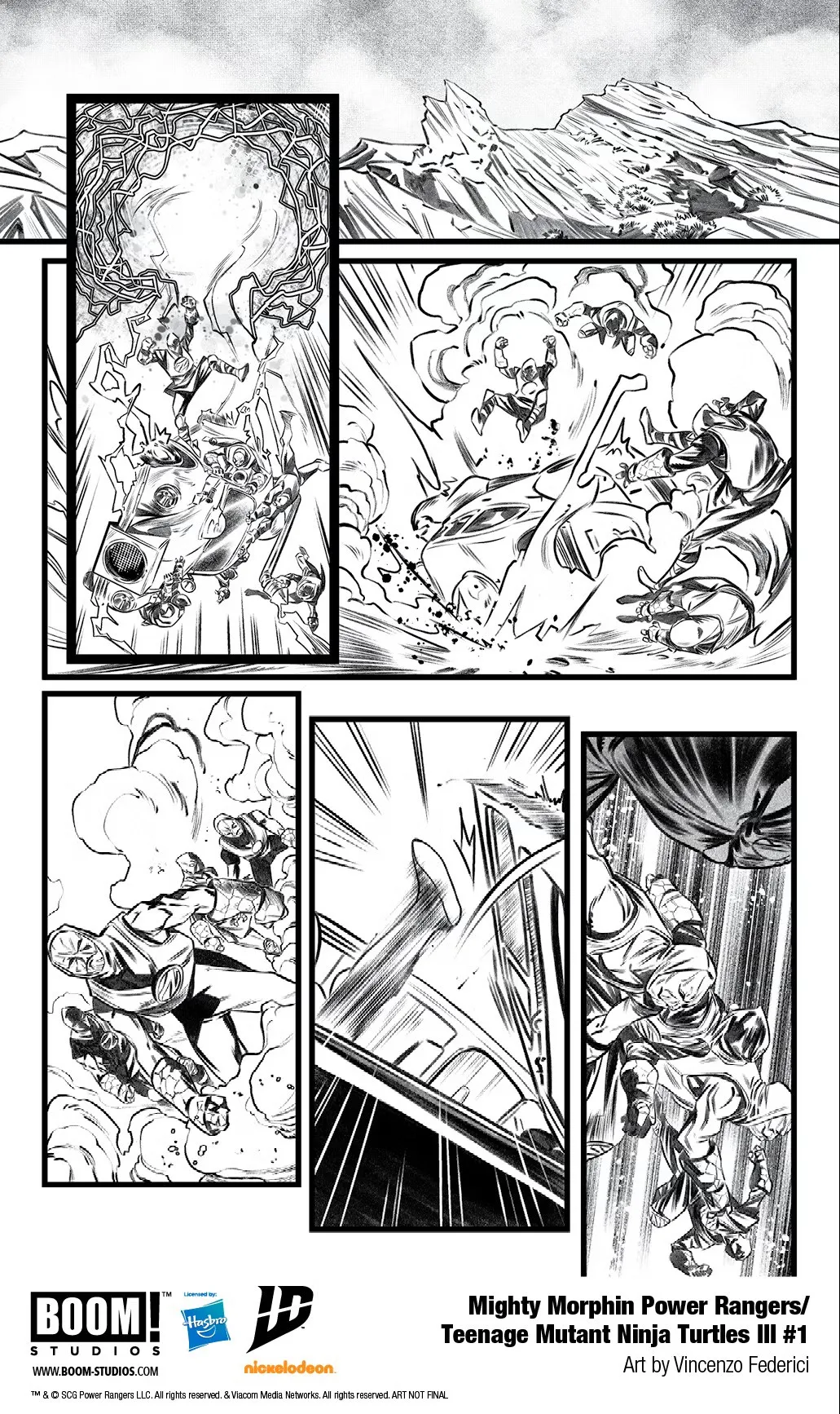 Despite the numbers advantage the Putties hold over the TMNT Ranger duo, Leo and Tommy are able to put them on their heels and carve their way through. That’s when things change suddenly, as Tommy looks up towards the sky and sees something approaching that seems to shake him up considerably from his expression. This is only magnified on the next panel, as the shadow of whatever is approaching beings to take over everything, and Tommy’s focus is fixed on whatever it is.