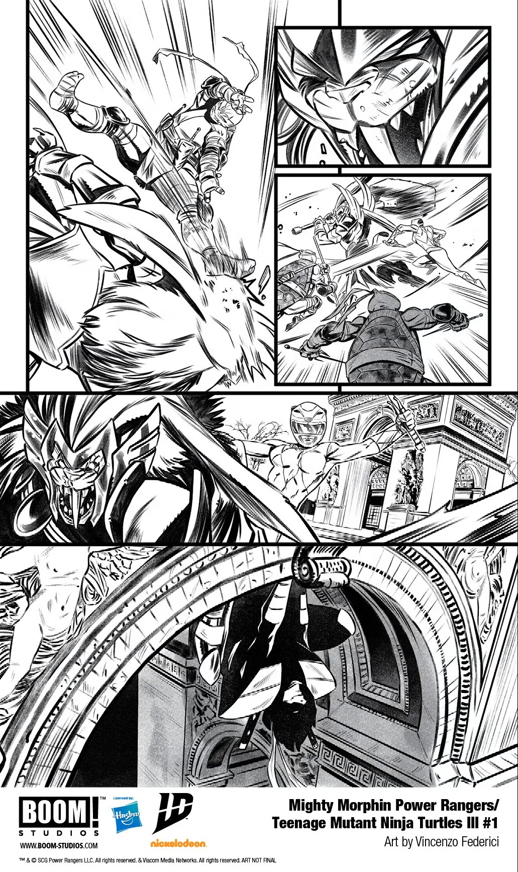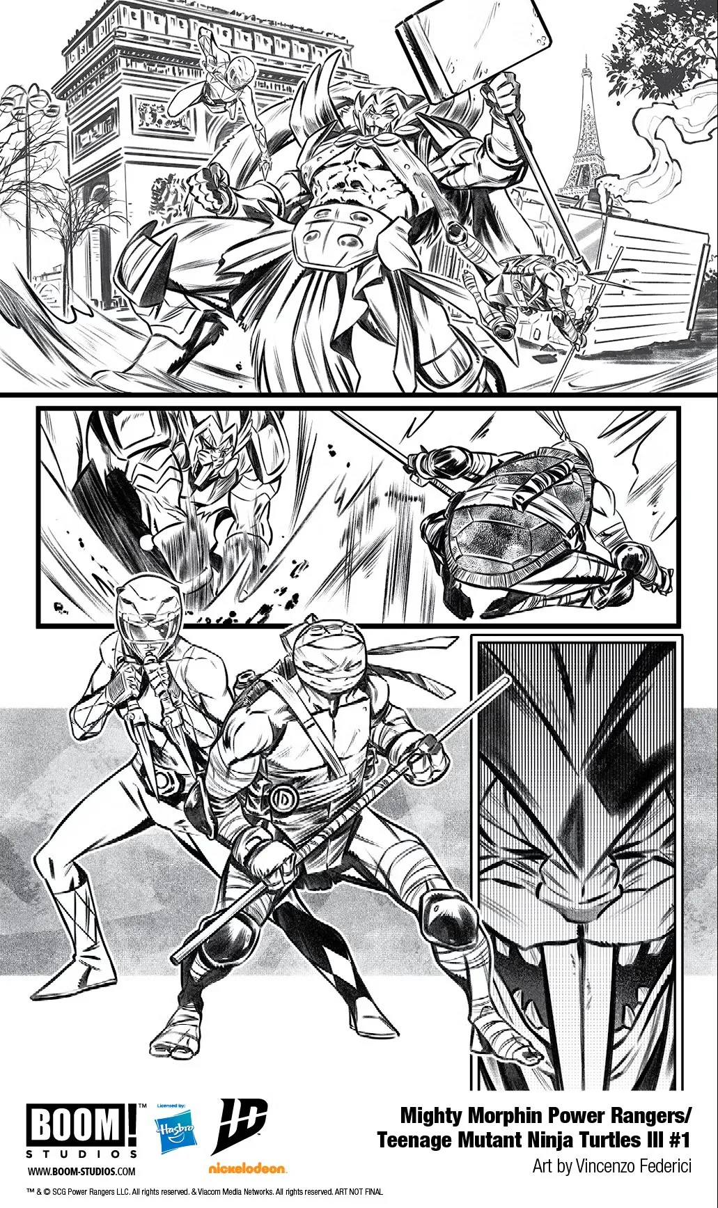 The next two pages shift to Michelangelo and Trini, who are somewhere else dealing with another massive threat in Paris. The next page then shows they aren’t alone, as Rafael and Donatello are also along for the ride, though what they don’t seem to notice is that someone is watching them from afar, perched just out of sight. While we don’t know some of the other threats the group will face, we do know that the primary villains will be Lord Zedd and Shredder, and they just might have the means to finally take everyone’s favorite heroes down for good.