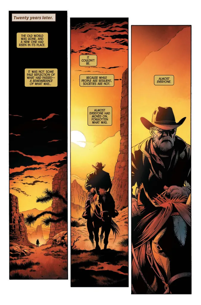 ComicBook has the exclusive preview of Wolverine: Revenge #4 by Jonathan Hickman and Greg Capullo. The story jumps ahead 20 years after Wolverine got revenge on Omega Red, Sabretooth, Deadpool, and his former X-Men ally Colossus. A lot of time has passed since then, and we learn that the world has moved on. A white-bearded Logan rides on a horse into Light’s Shadow, a western-looking town referred to as “The Territory of the People.” It’s an outpost for rangers, ranchers, thieves, and explorers. So in other words, the perfect place for an Old Man Logan to mosey on into.