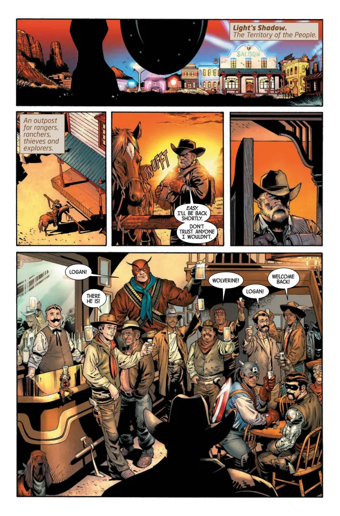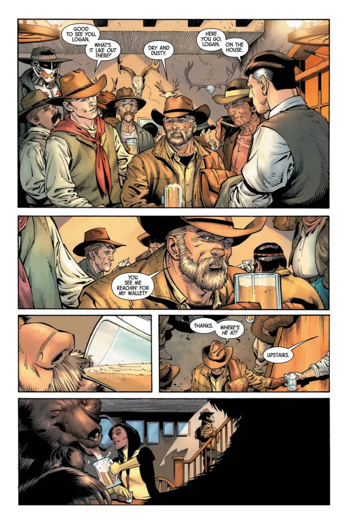 Wolverine gets a warm greeting as he enters a saloon. The bar folk are a mix of what you’d normally find in a tavern, along with drinkers dressed in superhero attire. We have a Captain America, Giant-Man, and a tiny Ant-Man sitting on the edge of the bar, all raising a glass to Wolverine. Another panel even has an Ultron wearing a cowboy hat and trenchcoat. The bartender gives Wolverine a drink on the house, and perfectly responds, “You see me reachin’ for my wallet?”