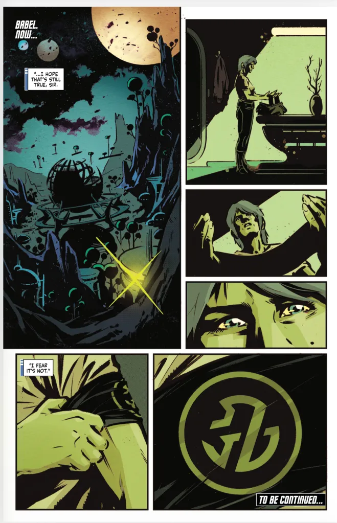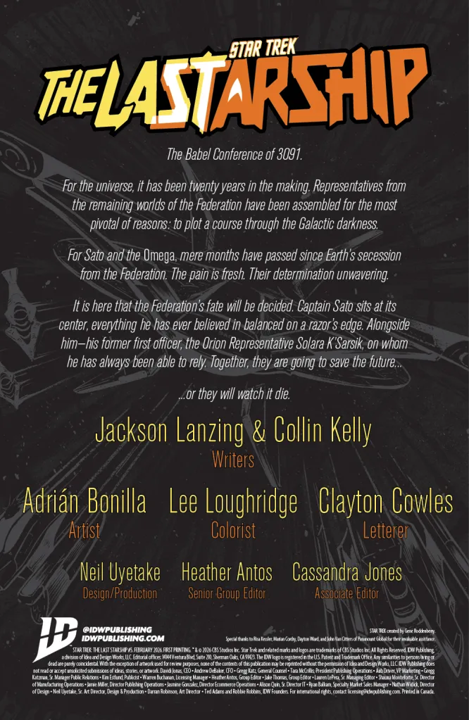Lanzing: The Babel Conference is finally here – and it’s going to be a rough ride for anyone hoping for that old-school Star Trek diplomacy. One of the few things we inherited in TLS from Discovery is an organization called the Emerald Chain, who sit somewhere between a protection racket and a capitalist superstate. Given the ways The Last Starship seeks to reframe our current climate through the lens of our most Federation ideals, it was only a matter of time before we looked at what happens when leadership falls into the hands of self-serving individuals… though Solara is much more complex than that one page might lead you to believe. In the same way that issue #4 acts as a self-contained character study about loss and transformation, issue #5 is a political thriller about the limits of trust in a world where the binds of history are no longer enough.