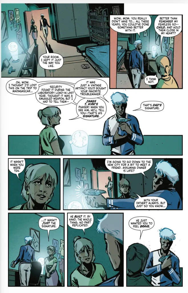 Kelly: We knew we needed a piece of childhood memorabilia for Wowie to work with, but the phaser itself was a bit of a happy accident. Wowie is us, in a lot of ways: they grew up loving Starfleet and wanting nothing more than to boldly go. So, what would we have wanted as kids? The classic TOS Phaser. And to have one actually signed by Shatner? Er, I mean, Kirk? That would be the most treasured item you owned. But as that idea hit the page, suddenly it’s not just an object for the scene; suddenly it’s a referendum on Wowie’s perspective on Kirk, as we wonder if they can be objective about a man they once idolized? And with the revelation that it wasn’t just a mass market bauble but something lovingly handcrafted by their father, we–like Wowie–get to feel the warming surprise of secret affection. Affection so secret that it was barely ever given to his face. Yes, it’s a toy, but it’s also a totem that contains Wowie’s greatest insecurities. Which is exactly why, after the words of his father, he leaves it behind.