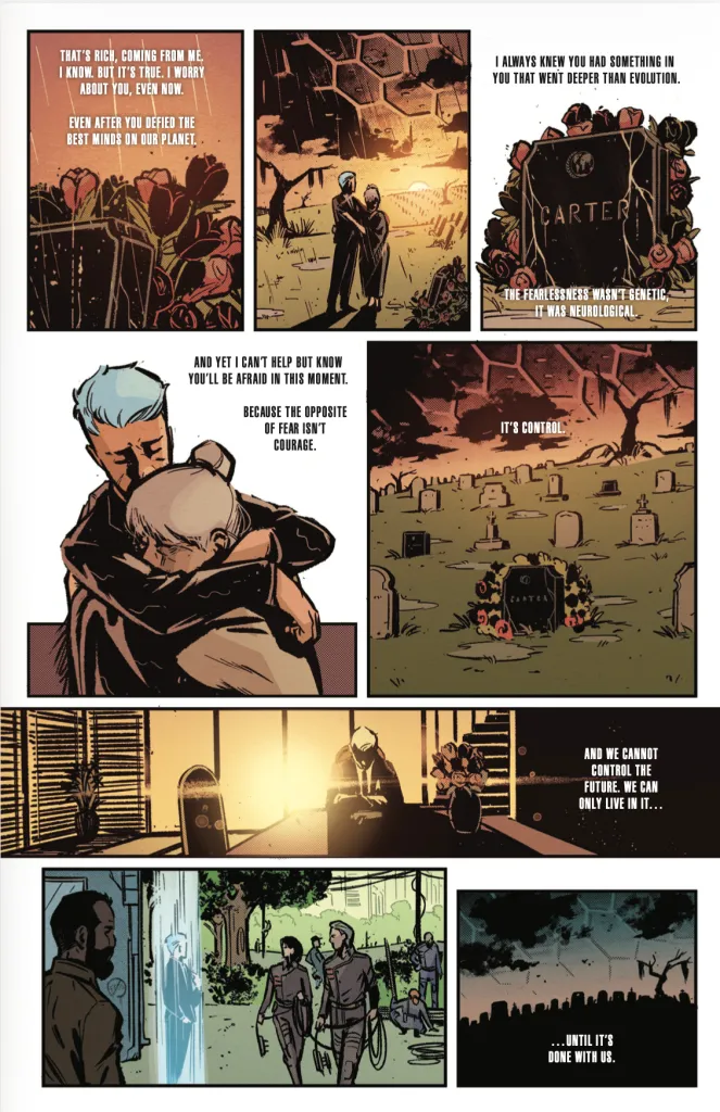 One of the things that I thought was particularly interesting about this issue is that you don’t realize right away that Wowie is questioning their role as First Officer until we see them meet with Solara. We also later see Wowie speaking with a man in the park. Both of those conversations feel important — what is it that tipped Wowie in the direction of stepping aside?