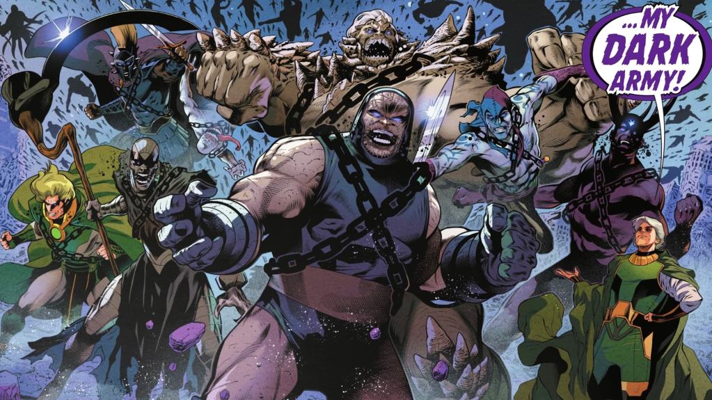 In Dark Crisis, the Multiversal traveler Pariah went insane after a lifetime of watching universes die. In a mad attempt to restore the original multiverse by destroying the current DC Multiverse, he harnessed the power of the Great Darkness, the source of all evil. Using the Great Darkness’ influence, Pariah assembled the Dark Army, which consisted of some of the most powerful and malevolent entities in the DC Multiverse. Pariah turned Doomsday, Eclipso, the Empty Hand, Neron, the Upside-Down Man, Spectre, Ares, Nekron, and Darkseid into his puppets. Pariah also took control of the entire Secret Society of Supervillains, adding them to his army. The Dark Army is the only supervillain team in DC Comics with numerous members capable of universal and even multiversal destruction.