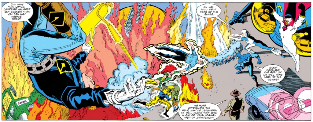 While this storyline was created in 1992, you’d actually be surprised at how much that doesn’t really matter. Most of those more notable ’90s elements are tied to the Justice League of America’s lineup at the time, which consists of Blue Beetle (Ted Kord), Booster Gold, Guy Gardner, Fire, Ice, Bloodwynd, and Maxima. That lineup holds several fan-favorites, but power-wise is considerably underneath other rosters that include names like Wonder Woman, Martian Manhunter, The Flash, Batman, Aquaman, and more. That didn’t bug me at the time, but later, as I got more analytical about comics, it did stick out as odd and almost like an asterisk next to what happened.