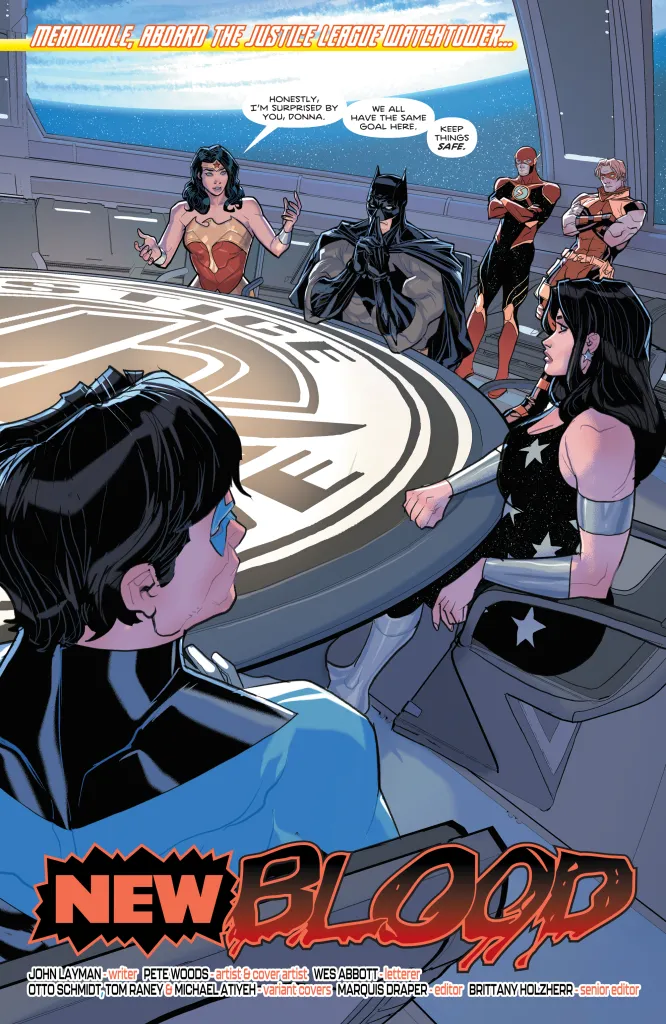 DC released a preview of Titans #23 by John Layman, Pete Woods, and Wes Abbott. It begins with Starfire and new recruit Vanadia rescuing citizens from a fire in Washington Heights, New York City. Vanadia is a cyborg designed by Professor Morrow using Amazo technology. In her words, Vanadia is “as strong as all the Titans combined.” This obviously makes her a valuable member of the Titans, but since she’s based on Amazo, she could also be used as a weapon against the heroes. However, one thing in Vanadia’s favor is that Cyborg made some improvements when he rebuilt her, so hopefully any evil remnants were wiped out.