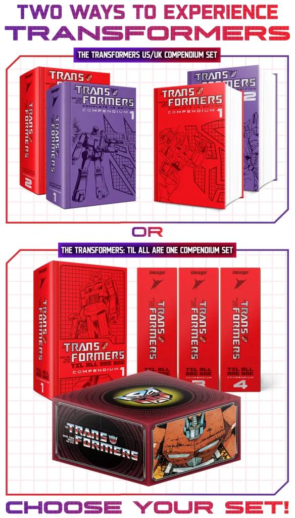 Fans can enjoy eight total books, including the two U.S. and two U.K. compendium sets, and exclusiveย The Transformers: Til All Are Oneย Box Set, which intercuts the U.S. and U.K. runs into the most seamless and comprehensive reading experience yet. This edition houses four hardcovers in a deluxe collectorโs box with new art from currentย Transformersย series cover artist Daniel Warren Johnson.ย