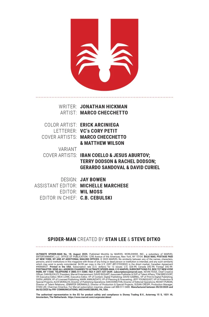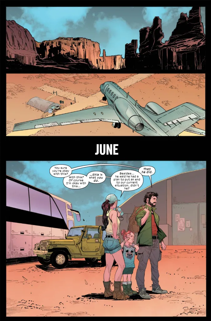 Marvel released a preview of Ultimate Spider-Man #18 by Jonathan Hickman, Marco Checchetto, Erick Arciniega, and VC’s Cory Petit. After Peter escaped from Kraven the Hunter, he went into hiding with his family out in the desert. However, Uncle Ben has kept Peter informed on what’s going on in New York. So Peter already knows Harry is alive before Harry flies into the desert on a plane. Peter, Mary Jane, and their daughter May are on an airstrip as Harry’s plane flies in, and Peter asks Mary Jane if she’s okay with their plan. Naturally, Mary Jane reassures Peter, saying, “… this is what you do.” Plus, Harry has a plan to end their days of running.
