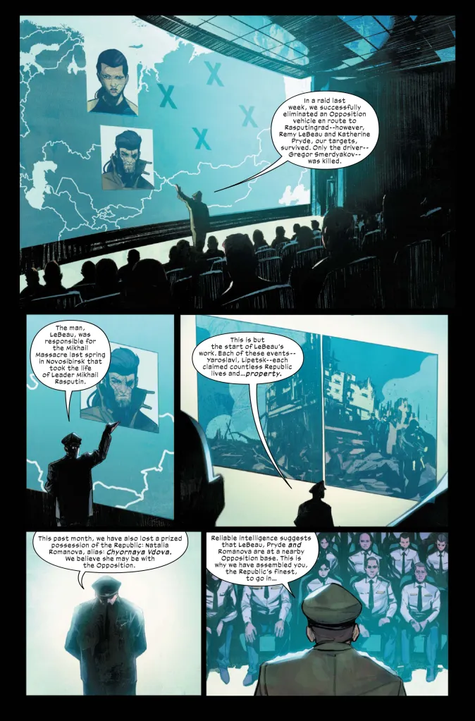 In particular, Gambit is responsible for what’s called “the Mikhail Massacre” that killed Colossus and Magik’s brother, Mikhail Rasputin. The trio of villains also lost one of their prized assets, Natalia Romanova, alias Chyornaya Vdova. This is the Russian name for the Black Widow, who the Republic now believes is working with the Opposition. Gambit, Kitty Pryde, and Black Widow are believed to be hiding in a nearby Opposition base, and the Republic sends Ultimate Wolverine and a team of soldiers to take them down.