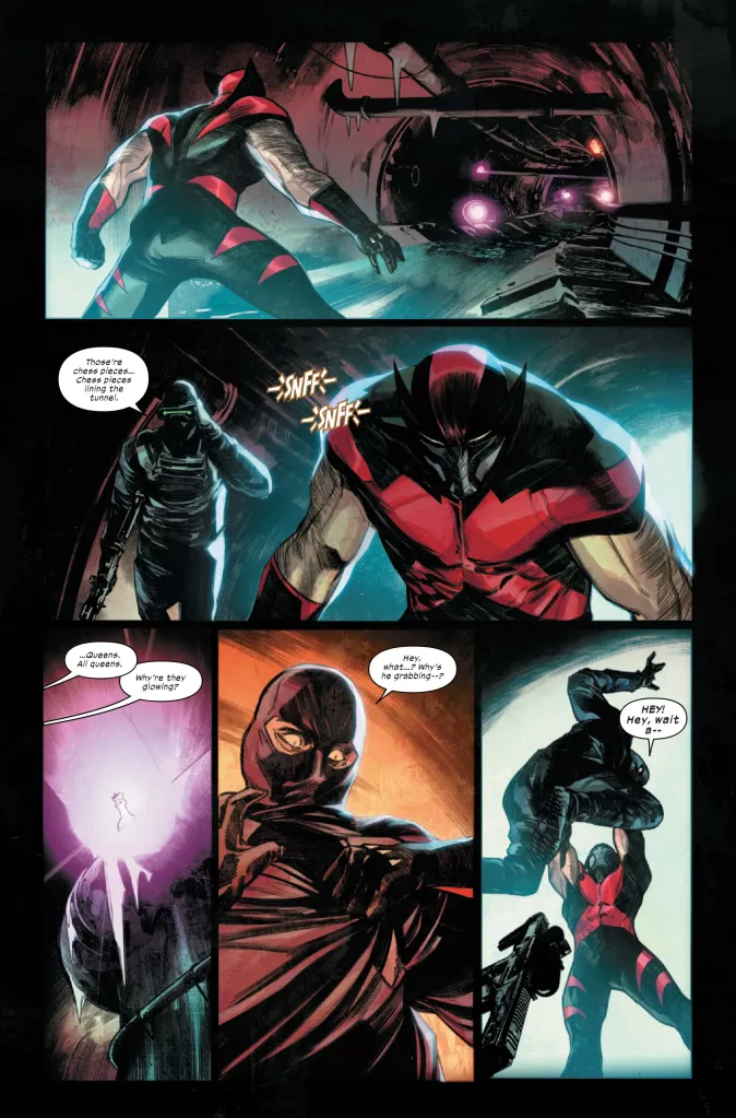 Wolverine and the team enter through an underground sewer tunnel. The soldiers are armed with Adamantium bullets, just in case the Winter Soldier gets out of line. One of the soldiers spots chess pieces lining the sewer walls, and when he picks one up it starts glowing with purple energy. Of course, these chess pieces have been juiced up by Gambit’s mutant power over kinetic energy. It appears Remy LeBeau has set a booby trap for any trespassers. The Winter Soldier grabs the soldier and tosses him up ahead to trigger the traps, which is where the Ultimate Wolverine #3 preview comes to an end.