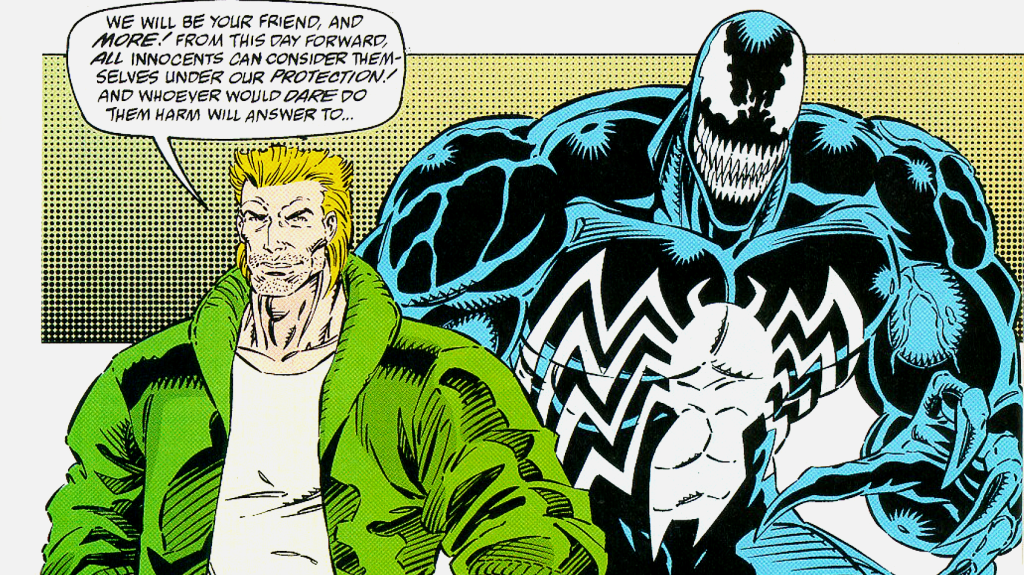 In Venom: Lethal Protector (1993) by David Michelinie, Mark Bagley, and Ron Lim, Eddie Brock and Venom decide to leave New York City for brighter pastures and a fresh start far from the primary cause of their shared misfortunes — Spider-Man. They choose to relocate to San Francisco, Brock’s hometown. But a change of scenery isn’t the only transformation they’re seeking. Through their past encounters with Spider-Man, some of his goodness seems to have rubbed off on them, inspiring a decision to turn over a new leaf. As they swing across the San Francisco skyline, Venom sums up their new outlook: “Protecting the innocents is satisfying indeed — after all, we were innocent once before.”