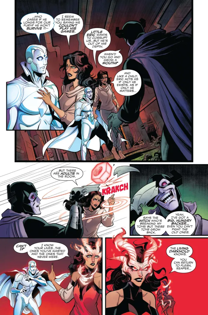 Not one to let Grim Reaper get the upper hand, Scarlet Witch begins harnessing the Darkhold to torture Grim Reaper with all of the lives he wasted and that never were. We see images of Grim Reaper as an agent of S.H.I.E.L.D., an ionic superstar, and a firefighter… all echoes of the good paths he could have taken, that Grim Reaper only looks at as nightmares. The preview of The Vision & The Scarlet Witchย #4 ends with Grim Reaper looking legitimately terrified at the ghosts of himself. Meanwhile, Scarlet Witch’s head starts to form devilish horns, most likely from the Darkhold influence inside her.