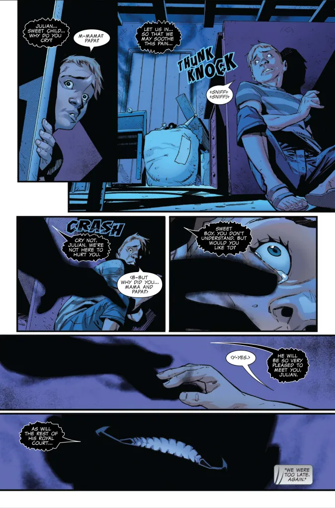 The preview begins with an ominous, mysterious voice speaking to a kid named Julian. The figure appears to break into Julian’s home and reaches out with a hand to take Julian away to someone and their “royal court.” Next, our Wolverines arrive too late to save the day. They find Julian’s parents killed, and a small axe left behind as a possible murder weapon. Deadpool is the one who alerted Logan and Laura to someone stealing mutant kids from a town.