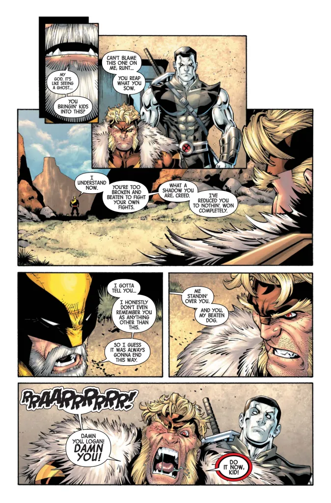Wolverine tries to goad Sabretooth by calling him a coward for having someone else fight his battles for him. The tactic seems to work, cause Sabretooth lets out a vicious howl before telling the boy, “Do it now, kid!” What that is remains a mystery for now, as the preview of Wolverine: Revenge #5 comes to an end.