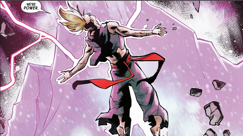 As Giant-Size Age of Apocalypse begins, Ms. Marvel and Legion — still weakened from his previous battle against Jean Grey and Kamala during their last time stop — encounter Rogue and other members of Magneto’s X-Men. They are preparing for a final assault on Apocalypse, hoping to seize the M’Kraan Crystal, which had been used in the original series to travel back in time and prevent Legion’s attack on Magneto that ultimately led to Xavier’s death. Legion and Ms. Marvel agree to help. However, just as the team is on the brink of success, Legion — realizing the crystal may hold the key to locating David Haller — betrays them and attempts to claim its power for himself, seemingly absorbing much of its energy. Before he can finish, Ms. Marvel intervenes, and the two are once again pulled into a time jump.