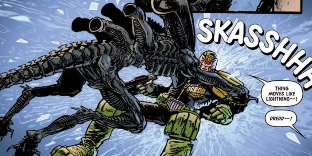 He may carry the devastating power of the Lawgiver, but even the mean streets of Mega-City One can’t fully prepare Judge Joe Dredd to face the offspring of a Facehugger in the pages of Judge Dredd vs. Aliens: Incubus. After a chestburster hatches from a crook in one of Mega-City One’s hospitals, it eventually leads to an all-out xenomorph war between the Judges and the alien menace, with Judge Dredd himself leading the way. Judge Dredd’s jaded cynicism and post-apocalyptic setting makes him the exact kind of comic book anti-hero perfect to face xenomorphs in an exhilarating comic book crossover like Judge Dredd vs. Aliens: Incubus, and it wasn’t a first for him, either. Just three years earlier, Judge Dredd was also battling another alien enemy in the pages of a comic book crossover in 1997’s Predator vs. Judge Dredd.