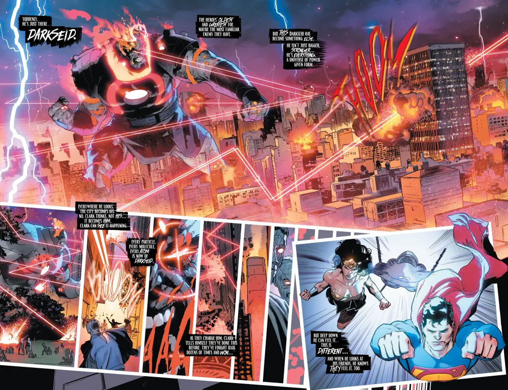 As impressive as the dialogue is, DC K.O. impresses visually as well, thanks to the art, colors, and lettering of Javi Fernandez, Xermanico, Alejandro Sanchez, and Hassan Otsmane-Elhaou. The first Darkseid sequence alone just about steals the show, and this team has simply mastered how to make a scene pop with an Omega Beam. There’s a creativity to these sequences as well, including an immensely impressive page that has one unifying figure spread across four panels, and each panel represents a different city and army standing against that unifying figure, and that’s even layered with a host of smaller breakout panels showcasing the resulting devastation. It’s absurdly cool and not something you see every day.