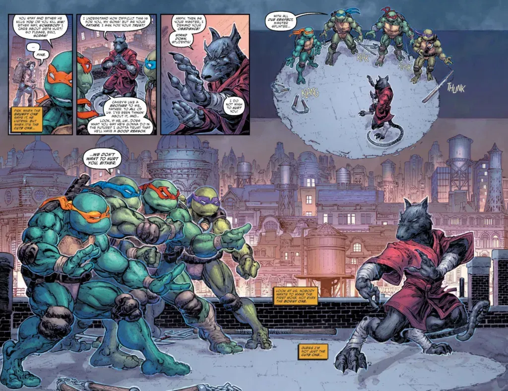 Once the fight kicks into gear, the amount of movement and fluidity involved in each moment of the battle can’t help but impress, and there’s also always something happening in the background that continues to build momentum into the next section of the fight. The colors absolutely pop as well, and there’s one particular Splinter moment that leaps off the page in more ways than one.