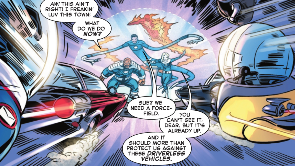 However, Rodin goes over the edge when his idea for a โsmart cityโ is stolen by Mister Fantastic. Here, he becomes their classic antagonist, the Mad Thinker, and takes control of every electronic device in Times Square to kill his enemies. Itโs an intense and brutal fight, but the Fantastic Four make it through thanks to teamwork and quick thinking. Oh, and we canโt forget, this publication also features a โFantastic Science with Mr. Fantasticโ backup detailing the science behind flying cars (and a lesson in why Johnny Storm should never tinker around with Reedโs inventions).