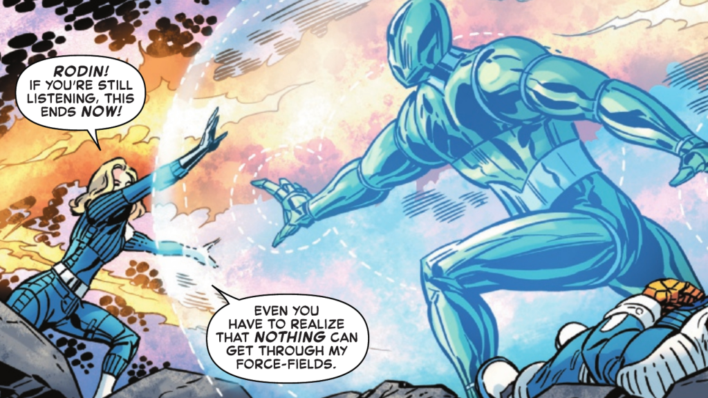 Like the previous special, Fantastic Four: First Foes #1 is set in the earliest days of the titular team. We get a new look at the Fourโs voyage in the Excelsior, a mission overseen on Earth by Reed Richards old college professor, Renรฉ Rodin. Rodin is there when the Excelsior is belted with cosmic rays, and itโs his quick thinking that ends up saving the team and getting them back to Earth. Sadly, while the world fawns over the First Family and their new powers, no one seems to care for the mind that helped save them.