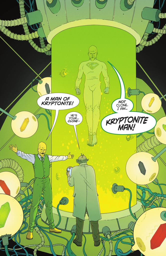 The Kryptonite Man is, of course, a known Superman villain that the hero has fought off and on since the ’60s. His origin has changed frequently, but he’s commonly depicted as a scientist who can emit traditional kryptonite radiation. It’s funny because the two people that Lex uses as part of Project M.O.K. are actually previous incarnations of Kryptonite Man (K. Russell Abernathy and Clay Ramsay). But this is a different continuity, and their sacrifice has led to Lex Luthor creating what’s almost certainly the most powerful Kryptonite Man ever.