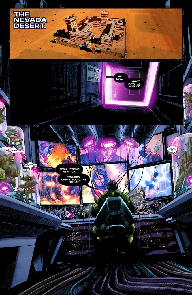 The other familiar face is also in the employ of Lazarus, specifically its R&D department, and that turns out to be Brainiac. He can be seen with his brain exposed and connected to a variety of devices, and you can also see what appear to be shrunken cities or entities in containers around him screaming in pain or for help. Video screens are all showing live footage of Superman, and Brainiac makes it clear he’s curious about who this new individual is.