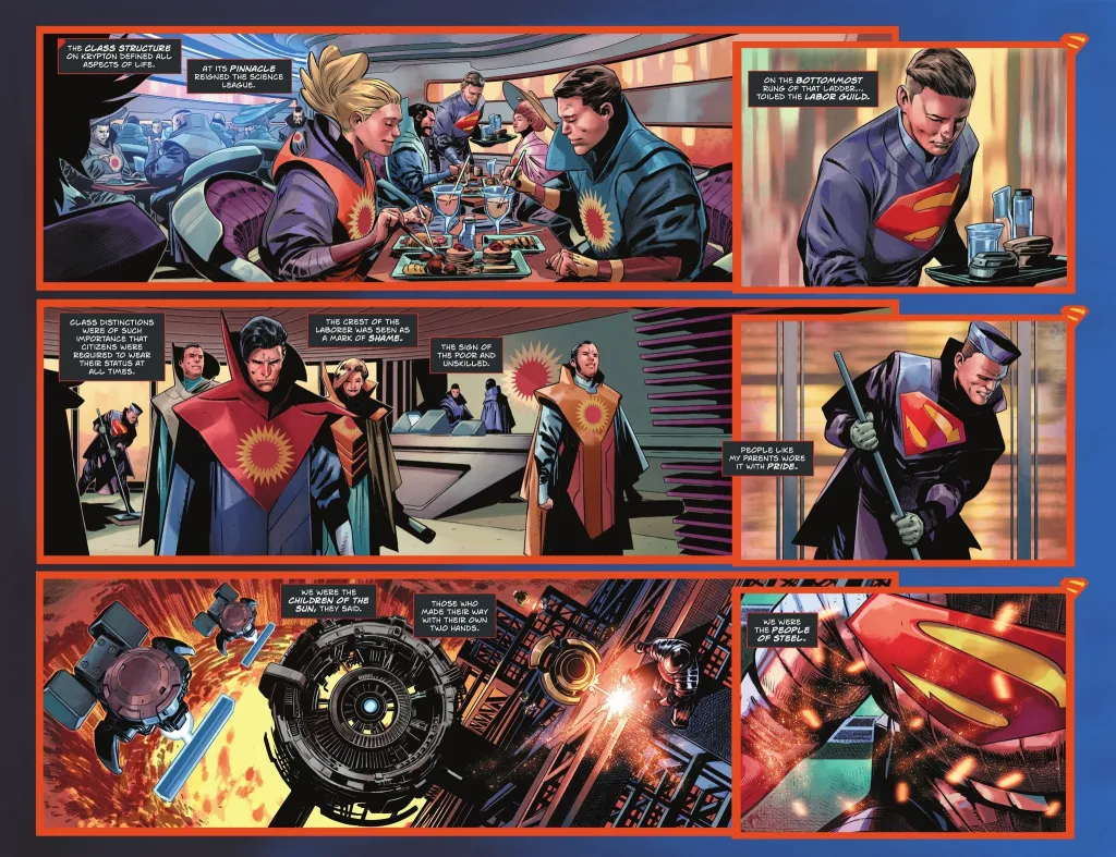 The changes start on Krypton years ago, and we quickly get a bird’s eye view of Krypton’s class system. The Science League sits at the top of the system, and we learn that unlike in the original story, Jor-El and Lara Lor-Van, who are Kal-El’s parents, are not a part of that class. Instead, they are part of Krypton’s lowest class, the Laborers Guild, and that is represented by the familiar S crest. They are also referred to as the people of steel.