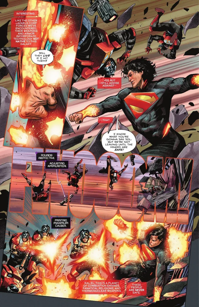 Two of Superman’s more iconic characters make their debut in this issue, and both are on the opposite side. After Superman is discovered, we see Lazarus send their Phenomena Field Team to the scene to confront him, and they do manage to knock him down. He then lights them up (literally in some cases) in the ensuing battle with heat vision (more on that in a minute), but is then confronted by a whole task force looking to take him down. That leads to one of the agents coming out of nowhere and cuffing herself to him, and that ends up being Lois Lane, who is an Agent for Lazarus.