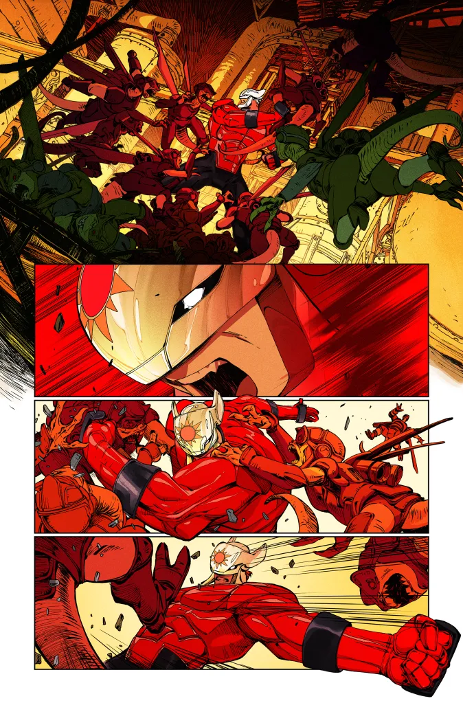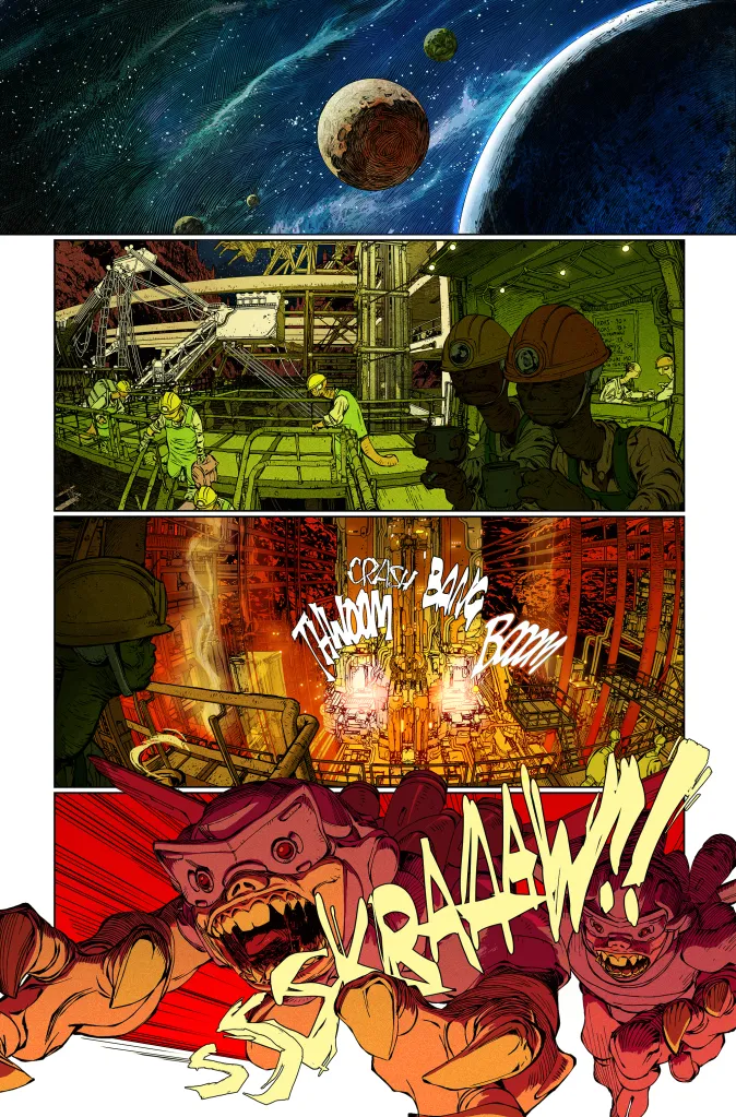 “I mean, it’s staggering that he’s able to do this kind of work for a comic that’s going to come out every month. And then the other thing that excites me in terms of Evan is that I brought him in for very Kirby-esque reasons. I think Kirby’s ability to transmit scale, Kirby’s ability to be this kind of atypical genre defining artist. I think Evan has all of those qualities, but also contemporary influences. You can see Otomo and Japanese manga and anime and Durer and Moebius in there. So. Yeah, no, it’s just super exciting to be able to work with someone whose work makes me want to do interesting, better work myself,” Ram V said.